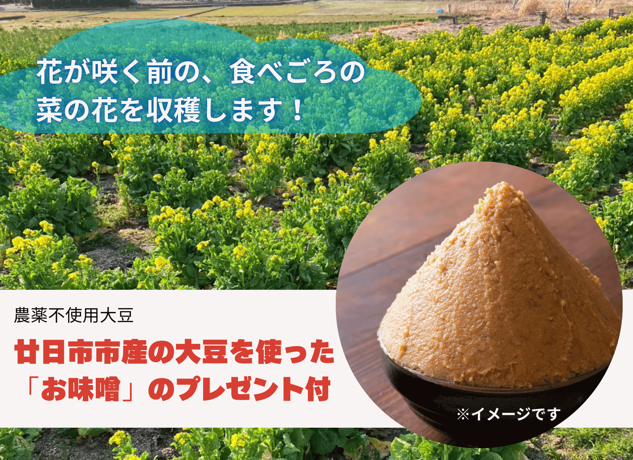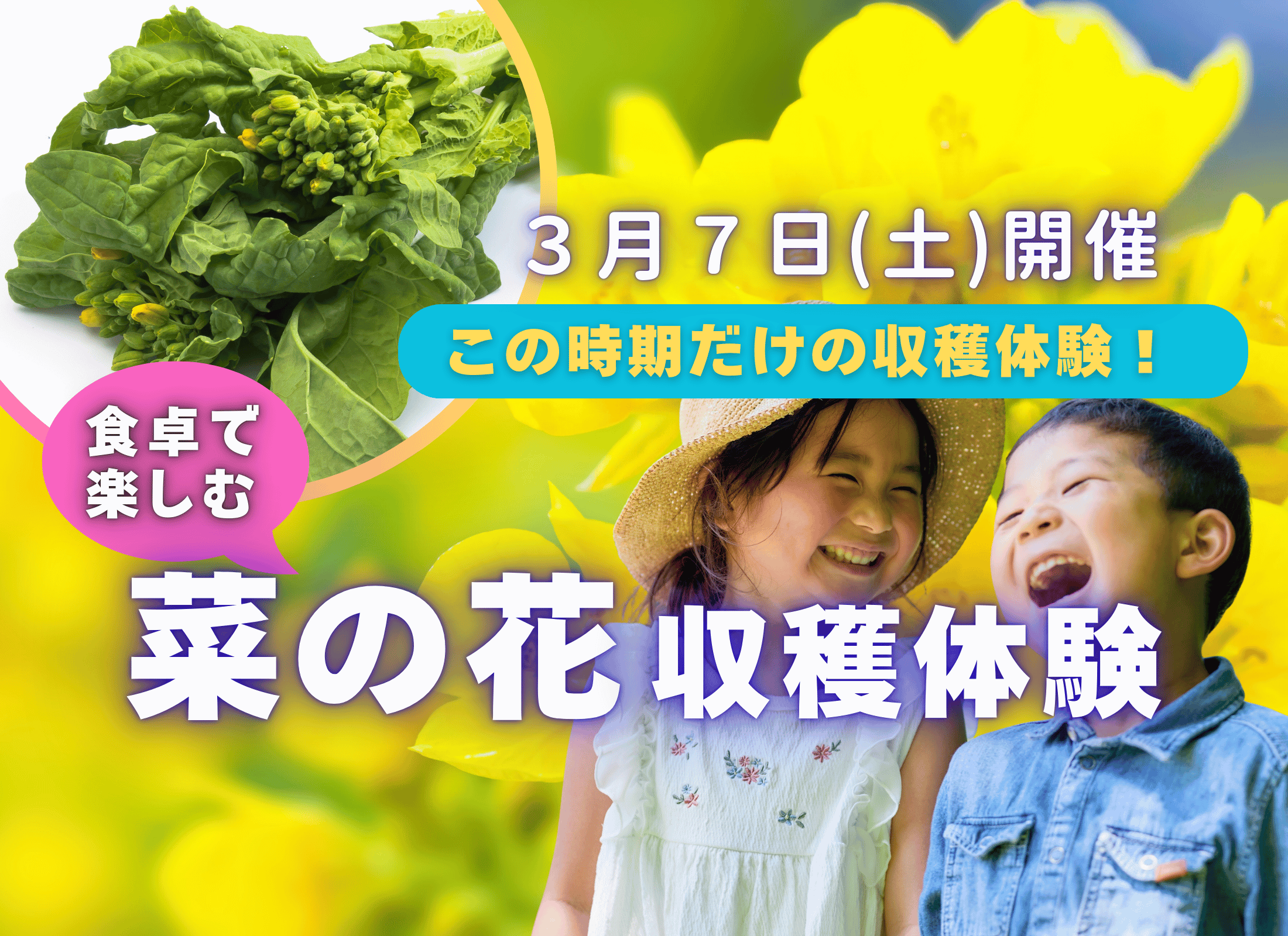 ※菜の花の生育状況によっては、開催日を3月14日(土)へ 変更させていただく場合がございます。